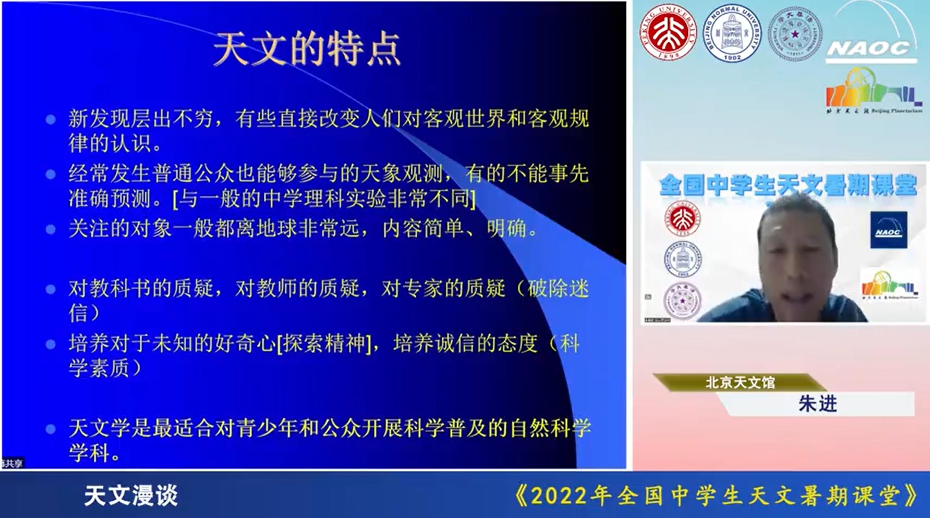 2022年7月16日,由北京大学天文学系联合北京师范大学天文系、清华大学天文系、中国科学院国家天文台(中国科学院大学天文与空间科学学院)和北京天文馆共同举办的第15届全国中学生天文暑期课堂线上活动成功举办!