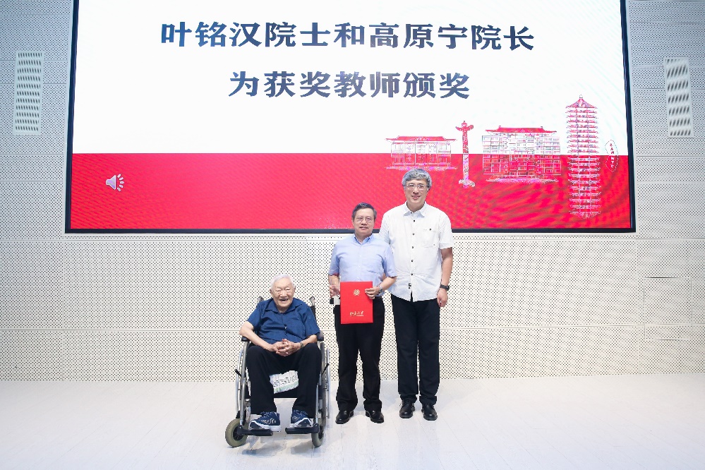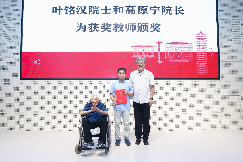 叶企孙师表奖评审委员会主任曹庆宏教授介绍了叶企孙物理教育基金的历史沿革和叶企孙师表奖的设立和评选过程,宣读了首届叶企孙师表奖获奖名单,并介绍了两位获奖教师的成绩与贡献。叶铭汉院士和高原宁为两位获奖教师颁发了奖杯和证书。