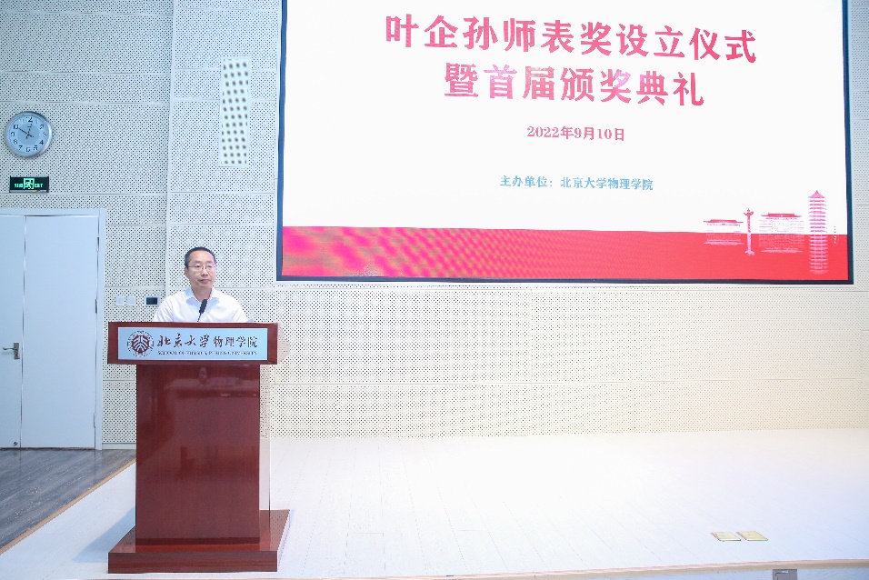 9月10日,时值第38个教师节,叶企孙师表奖设立仪式暨首届颁奖典礼在物理学院思源多功能厅举行。中国工程院院士叶铭汉,北京大学校长龚旗煌,北京大学教育基金会秘书长、校办产业党工委书记李宇宁, 北京大学党委办公室校长办公室主任王新强,北京大学物理学院院长高原宁,副院长曹庆宏、彭良友、颜学庆,党委副书记李焱、穆良柱,院长助理黎卓、孙琰、唐宁,首届叶企孙师表奖获奖人吴学兵、刘运全,各系、所、中心领导以及青年教师代表参加仪式。仪式由物理学院党委书记刘雨龙主持。