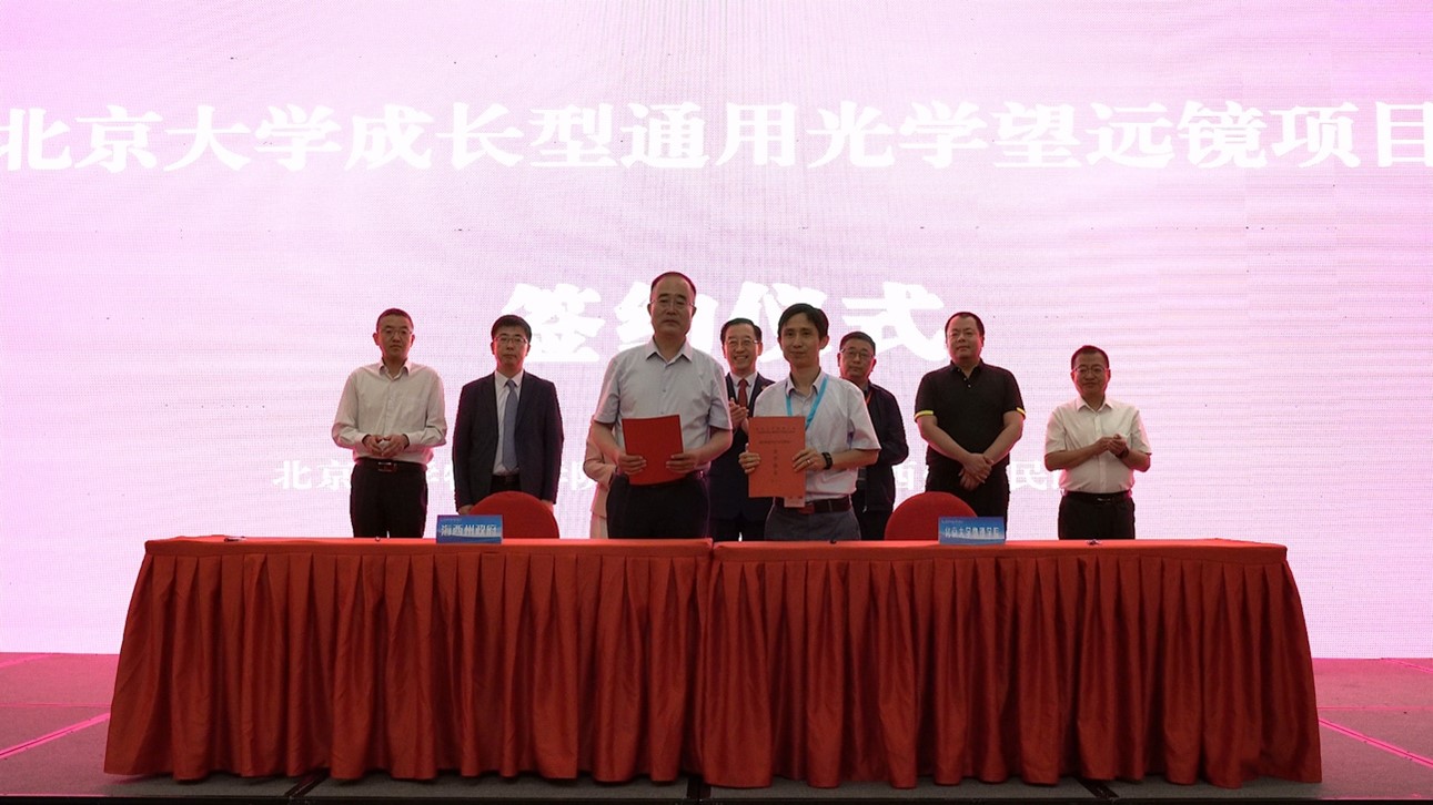 颜学庆与张银廷分别代表北京大学物理学院与青海省海西蒙古族藏族自治州人民政府签署了《成长型通用光学望远镜项目合作协议》。按照合作协议,双方将牵头在青海省冷湖天文观测基地合作建设成长型通用光学望远镜(EAST),为我国科学家打造一台6-8米口径、世界一流的多样化光学波段观测利器,迅速缩小我国在光学望远镜上与国际的差距。成长型通用光学望远镜主要用于揭示星系的形成和演化、探索早期宇宙和暗物质、研究银河系与恒星及行星系统、追踪天体爆发与暂现源,有望在天文与物理相关学科领域取得有重要国际影响力的基础研究成果。同时,该项目将作为海西州打造冷湖天文观测基地和天文科技产业基地的重要支撑项目之一,对提高其知名度并促进地方产业进一步开放,对社会经济、高新技术的发展起到引导和推动作用。