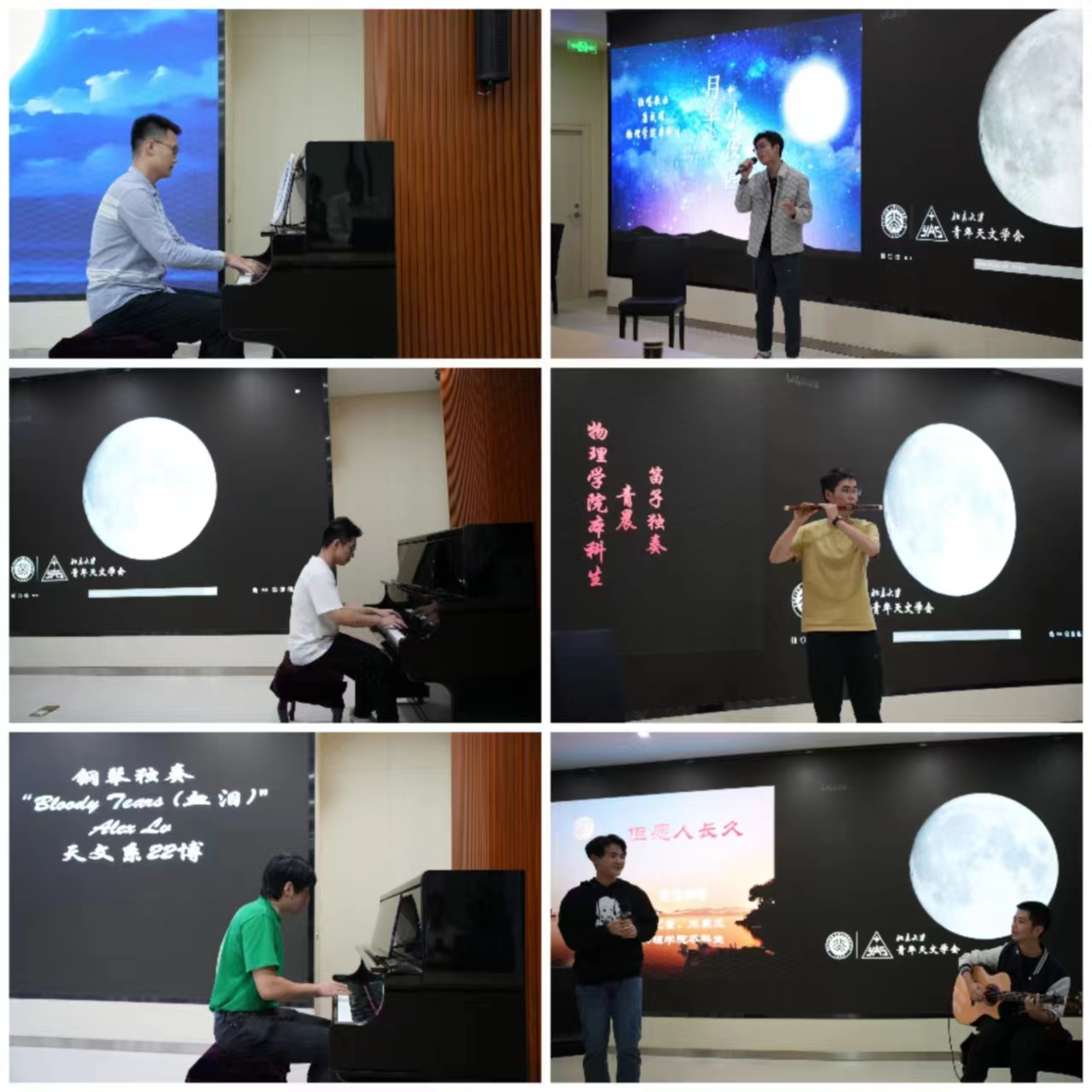 晚餐之后, 星空party进入新的环节, 天文系博士生朱睿同学演奏的“彩云追月”钢琴曲拉开了学生才艺表演的序幕。物理学院本科生唐成曜同学的独唱“月半小夜曲”柔情款款,天文系博士生Alex Lv带来的钢琴独奏“Bloody Tears”深邃动听,物理学院本科生青晨同学带来的笛子独奏“赤怜”悠远绵长, 黄晋安同学的钢琴曲“One Last Kiss”灵动跳跃,唐艺豪、朱乘风同学的吉他弹唱“但愿人长久”将大文豪苏东坡的千古绝唱又加进了他们的创意,将古典和现代相结合,展现了北大学子的才情和风貌。才艺表演同时,大屏幕上北京大学青年天文学会实时直播的月亮投影给了嘉宾别样的赏月感受。