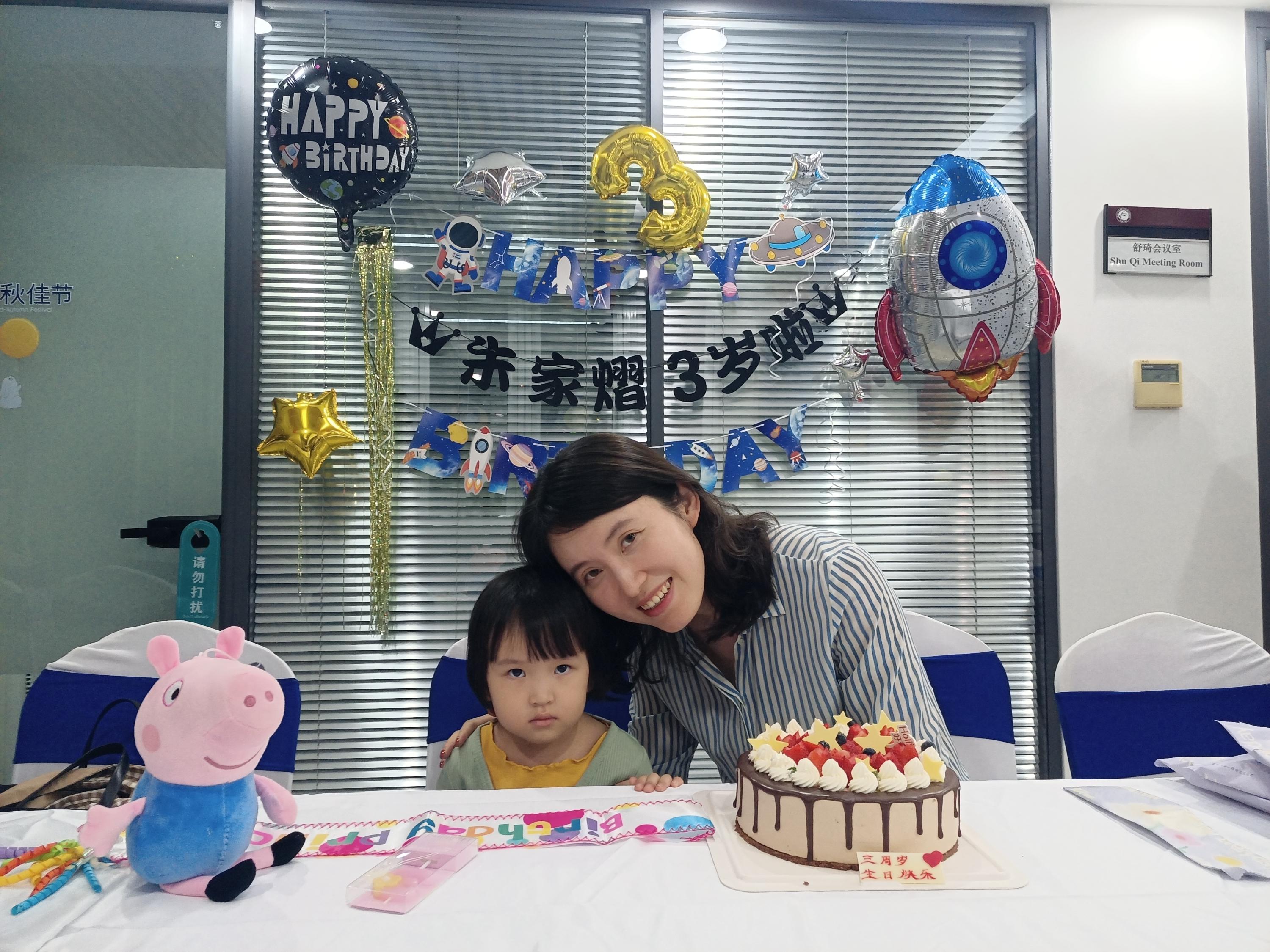 星空Party当然少不了美酒佳肴来佐兴。晚上6点后,科维理所大厅和连廊瞬间变成了欢聚场所, 嘉宾们一边品尝美食一边继续交流。来宾中还有不少小朋友的身影, 嘉宾们总是愿意带着孩子前来,希望孩子们能来这里感受北大的气息。 今天还有一个重要插曲是庆祝朱家熠小朋友的三岁生日,科维理所给她布置了一个小小的生日庆祝。 朱家熠小朋友清纯可爱, 此时懵懂的她可能尚不明白父母让她在北大度过三岁生日所蕴含的深深之爱和殷殷期许,或许她将来会知道幼时曾无意中见证了这样一个时刻,一批天文学家以及社会有识之士正在开拓努力,用全新的方式让中国未来能拥有大型光学望远镜, 其目的就是让他们这代人成长起来后,可以在中国用大型光学望远镜看到更广阔深远的星空。