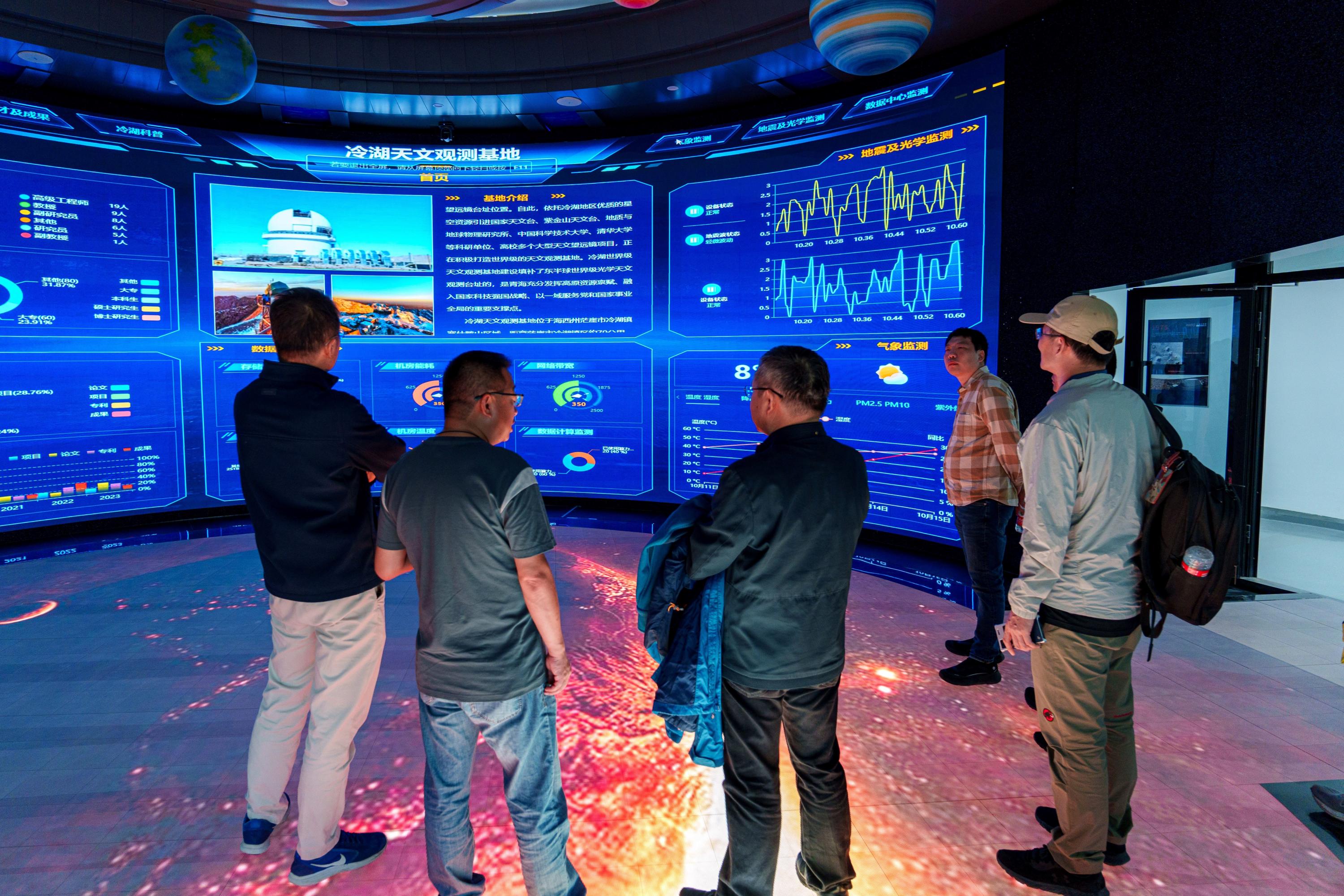 座谈会结束后,考察团在冷湖科创园管委会副主任李炜的陪同下,前往冷湖实验室参观。李主任和实验室成员向考察团详细介绍了实验室现有的科教项目和科普天文台,以及未来发展成为冷湖天文观测基地天文数据存储和计算中心的远景规划。