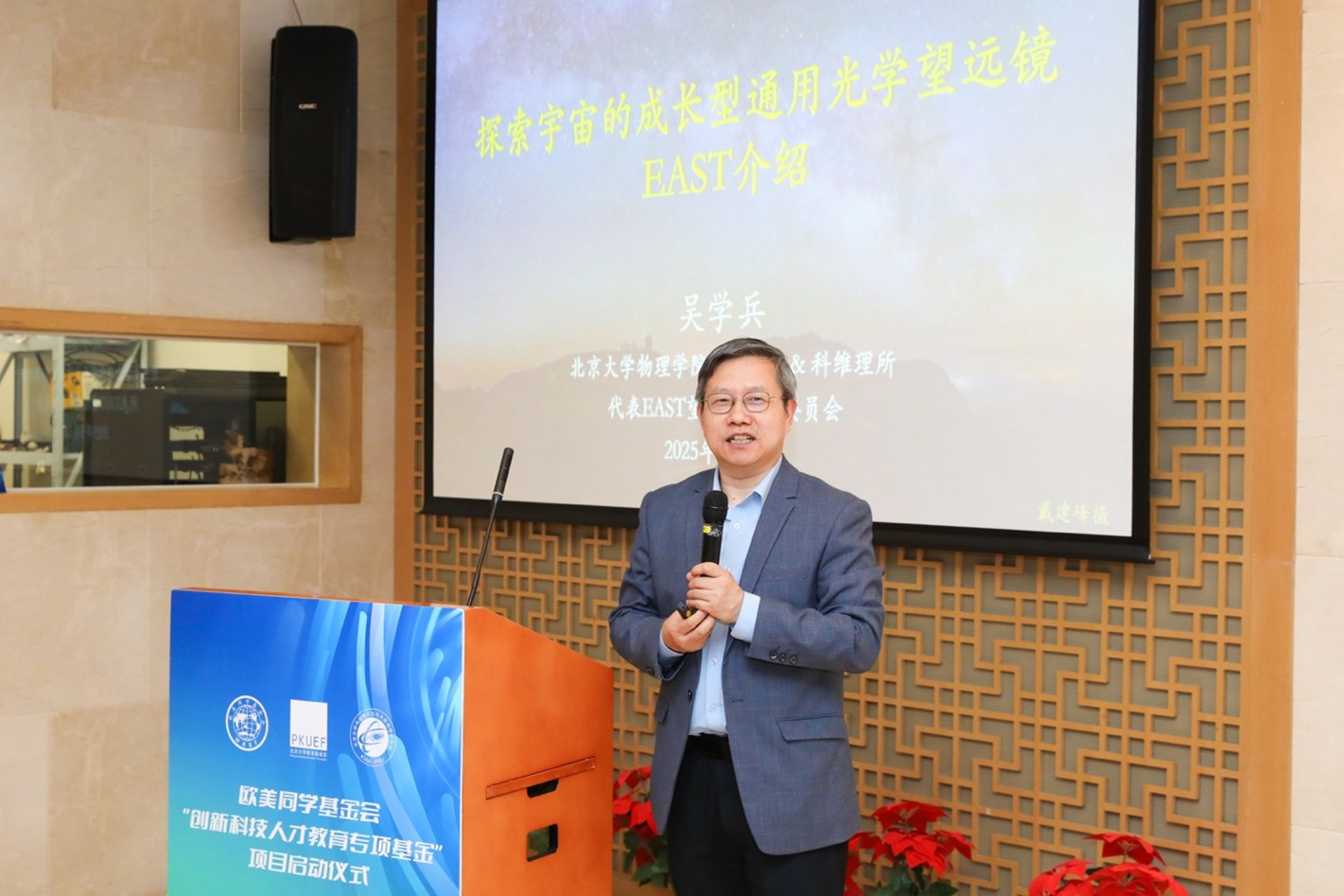 以此为契机,欧美同学基金会 “创新科技人才教育专项基金” 项目启动仪式在北大之友报告厅隆重举行。北京大学物理学院院长高原宁院士代表学院对欧美同学基金会的善举致以感谢,希望该基金会“创新科技人才教育专项基金”项目在推动北大天文科研发展和创新人才培养中发挥重要作用。欧美同学基金会理事长李军致辞时指出,“创新科技人才教育专项基金”旨在聚焦我国天文与物理学领域的人才培养、科研创新及科普教育,为建设科技强国作出贡献。天文学系吴学兵教授介绍了成长型通用光学望远镜EAST项目。作为亚洲口径最大的光学望远镜之一,EAST项目一旦建成,将大幅提升我国在天文学领域观测实力,在探索宇宙的科技前沿取得突破,希望社会各界予以支持。欧美同学基金会项目部武艺副主任介绍了“创新科技人才教育专项基金”,此次向北京大学科维理所捐资支持天文学项目,是该专项基金落地的第一个项目。未来五年将全力支持EAST望远镜建设,培养拔尖创新人才,为实现高水平科技自立自强注入强劲动力。