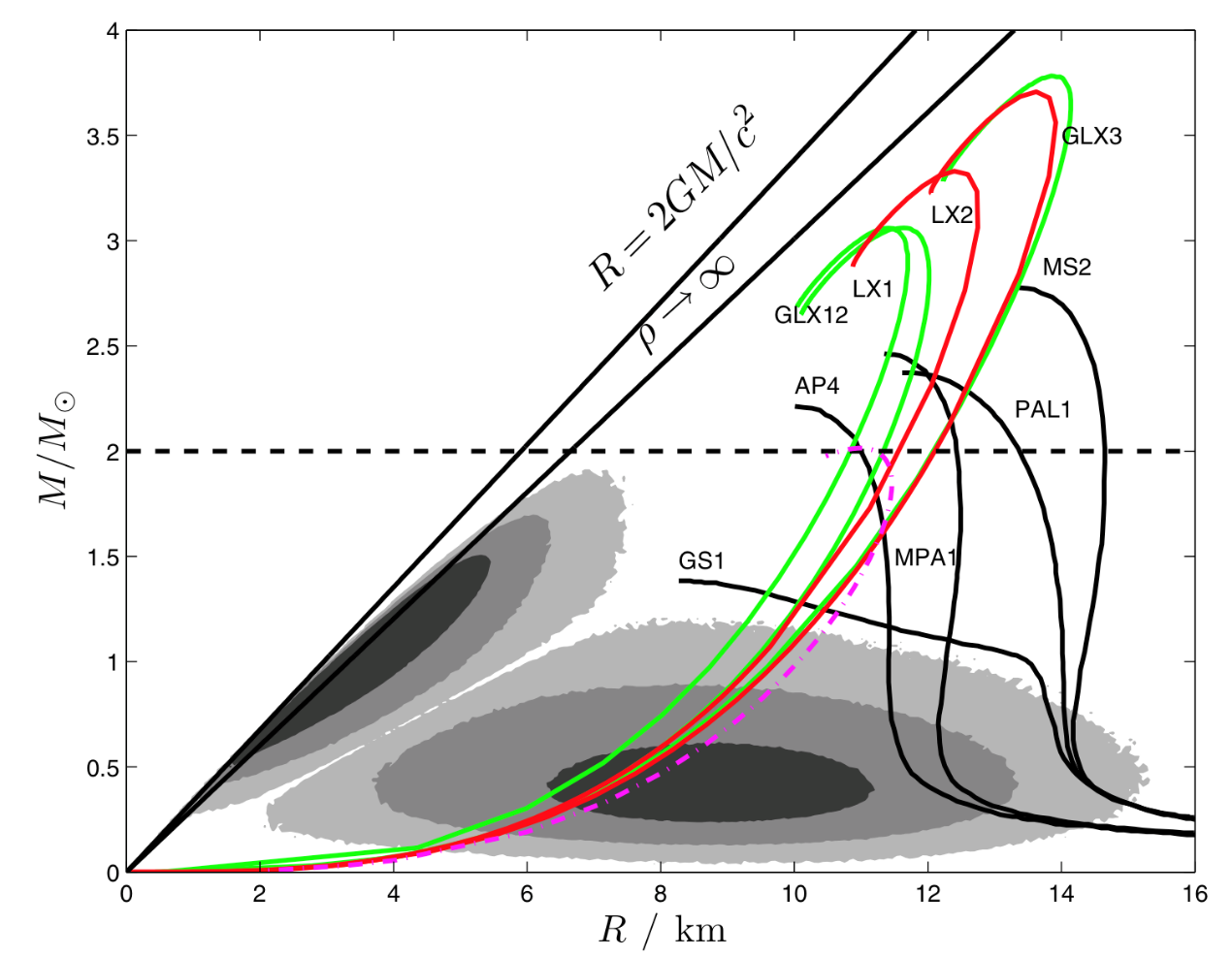 | 观测对双星4U 1746-37中致密星质量和半径的限制(图中深灰色区域的置信度达68%),并跟模型推测的质量半径曲线作对比。彩色实线由夸克集团星模型给出,而黑色曲线根据传统中子星模型得到。 |