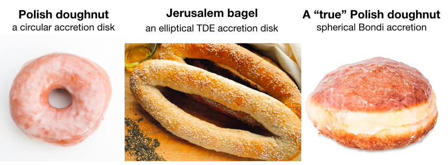 标准圆吸积盘通常被称为“波兰甜甜圈”(一个由著名科学家、英国皇家学会前主席Martin Rees爵士创造的名字。Martin Rees爵士同时也是TDE经典理论之父之一)。为了突出椭圆吸积盘与标准圆吸积盘在几何形状上的不同,同时保留以糕点命名的传统,以色列著名科学家Tsvi Piran教授为椭圆吸积盘创造了“耶路撒冷百吉饼(Jerusalem bagel)”(见下图)这一名字。为了强调与以色列Piran教授等人的椭圆吸积盘模型在几何上的相似性和物理上的不同性,在最近发表的论文中所描述的椭圆吸积盘被称为“来自北京的耶路撒冷百吉饼(Jerusalem bagels from Beijing)”。值得注意的是,真实的波兰甜甜圈的形状更类似于具有球状几何的邦迪吸积(Bondi accretion)。