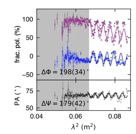 图1:法拉第旋转量的短时标演化。阴影区有FAST观测,但是没有探测到FRB暴发,说明FRB是突然熄灭的。