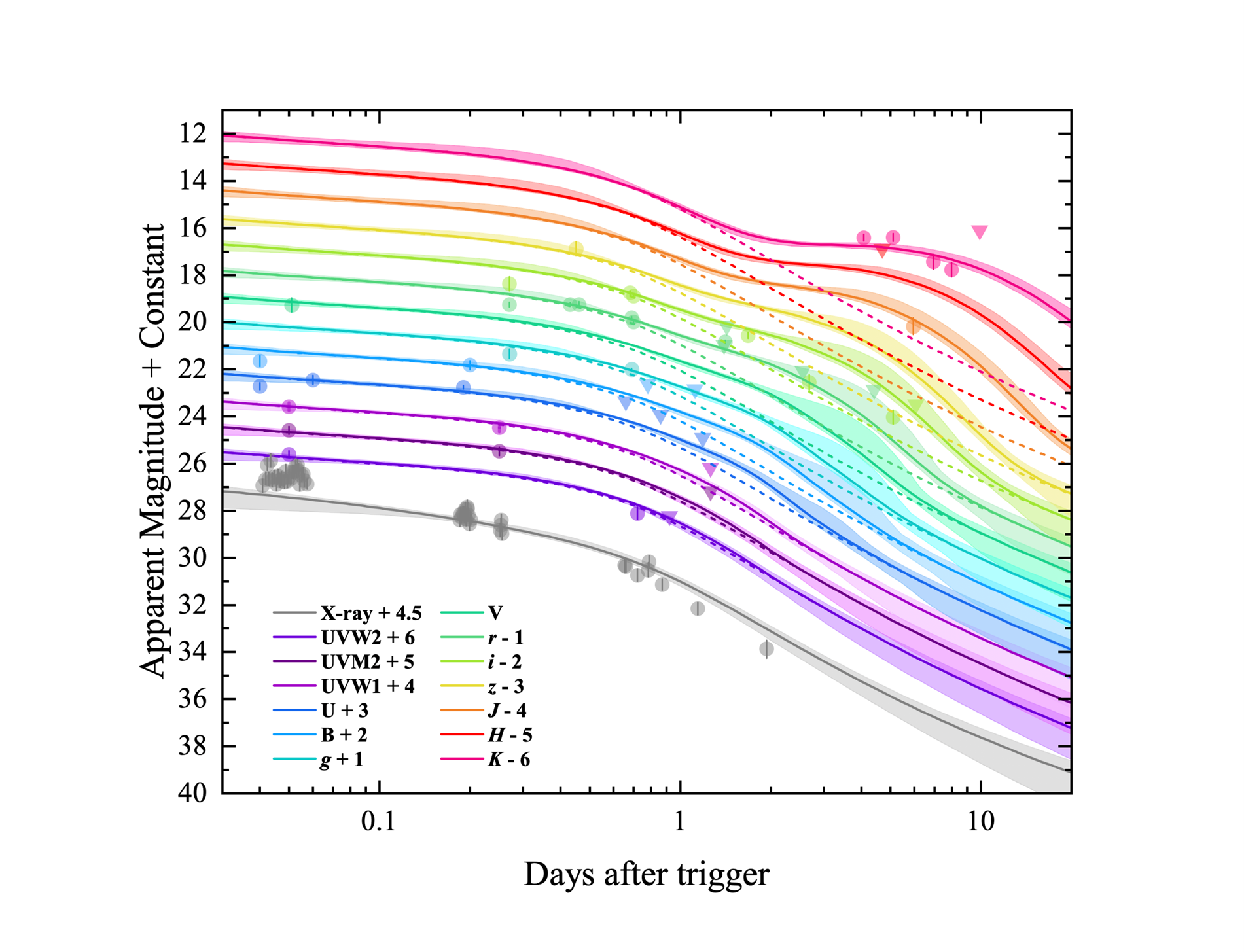 图2: GRB211211A光学波段余辉、千新星辐射及拟合结果。