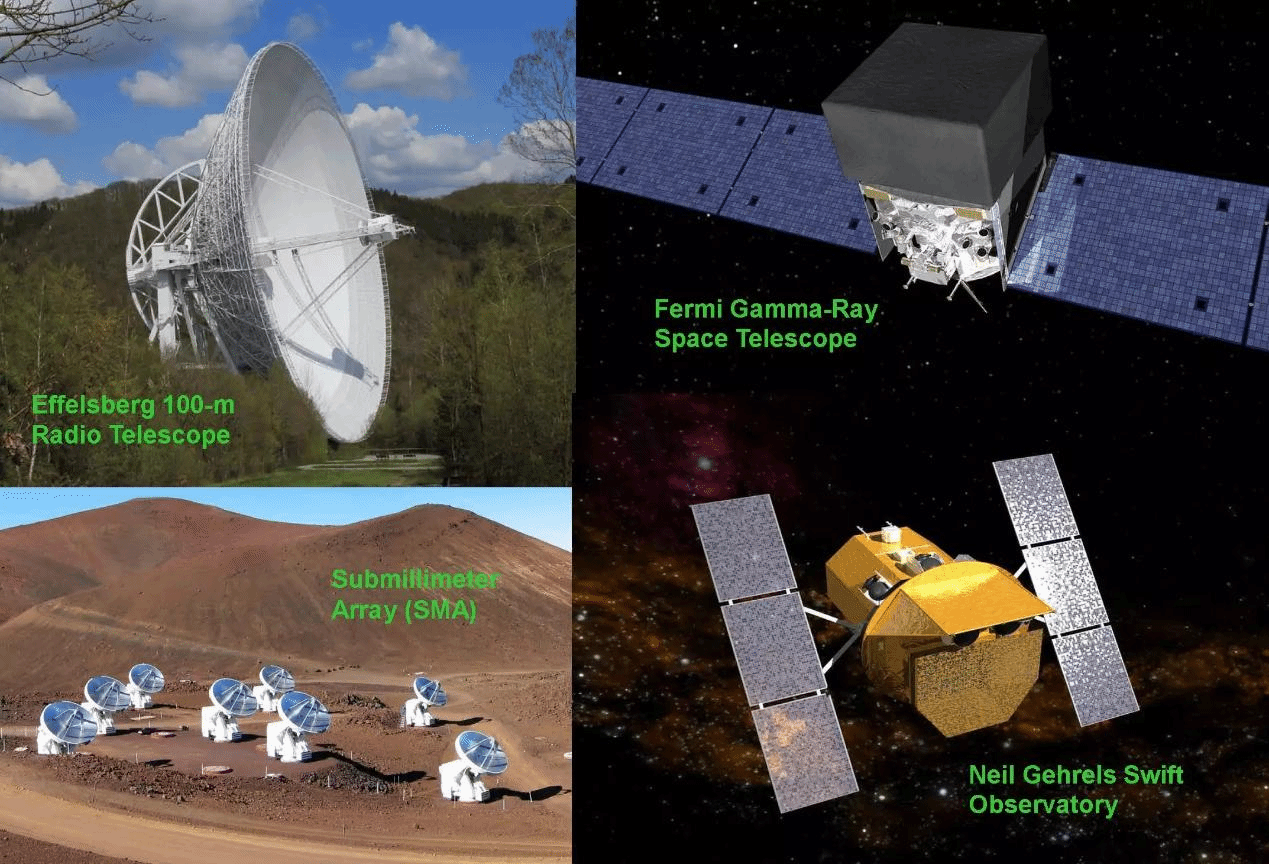 图2.用于观测的望远镜,包括两个射电望远镜:德国的Effelsberg 100米天线和夏威夷的亚毫米阵列,此外还有两个卫星观测站:伽马射线波段的Fermi观测站和光学、紫外和X射线波段的Neil Gehrels Swift观测站。