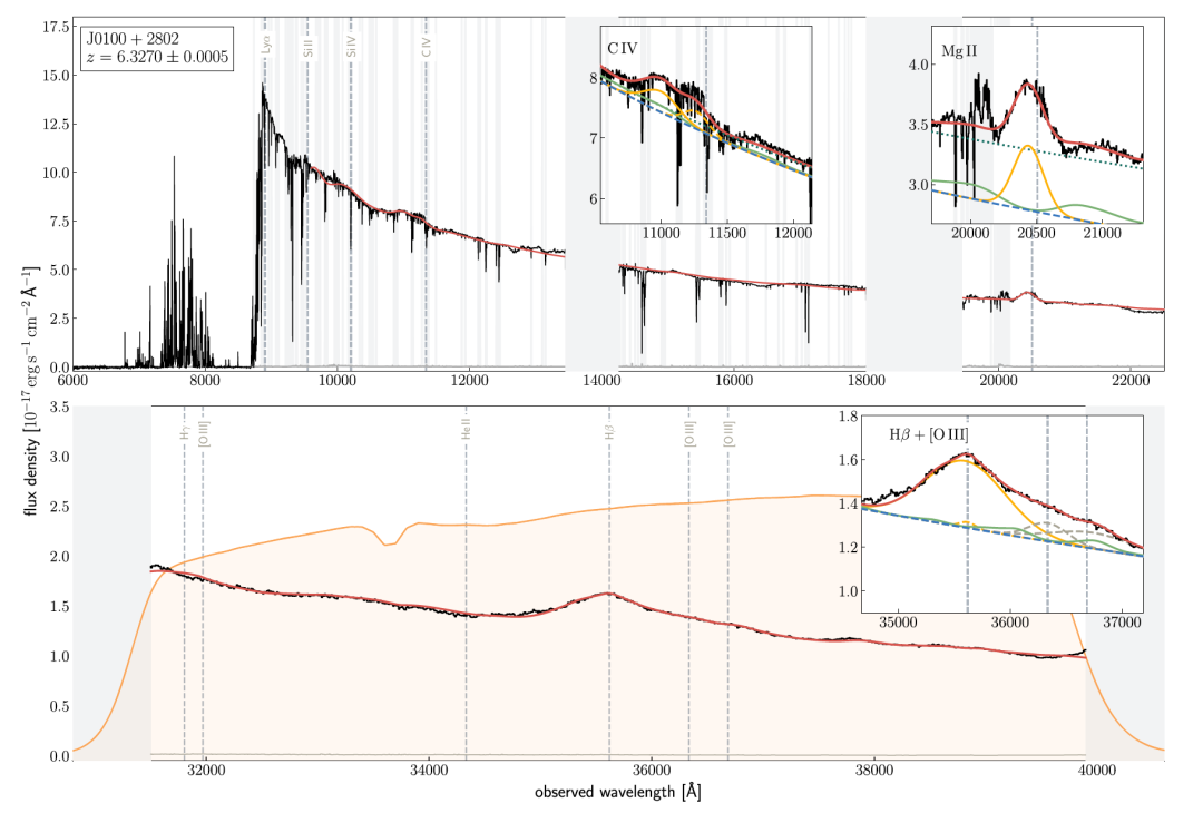2023年6月10日,《天体物理学杂志》(Astrophysical Journal)发表了以美国麻省理工学院和瑞士苏黎世联邦理工学院科学家领衔的国际团队利用韦布空间望远镜(JWST)对红移为6.32的类星体J0100+2802开展的红外波段成像和光谱观测结果,证实该类星体中心确实存在约百亿倍太阳质量的超大质量黑洞(Eilers et al. 2023, ApJ, 950, 68)。该类星体是北京大学吴学兵教授领衔的团队在约10年前利用中国科学院云南天文台丽江2.4米望远镜发现的,发光强度是太阳的430万亿倍,是宇宙早期发光最亮的类星体。吴学兵团队利用近红外波段后随光谱观测发现该类星体中心存在约120亿倍太阳质量的黑洞,在宇宙大爆炸后只有8亿年的时候就存在质量如此之大的黑洞,对宇宙早期星系和黑洞的形成和演化理论提出了挑战。该发现在2015年2月26日作为封面推荐论文发表于Nature(Wu et al. 2015, Nature, 518, 512),论文至今被引用590次,成果入选2015年中国科学十大进展和高等学校十大科技进展。
