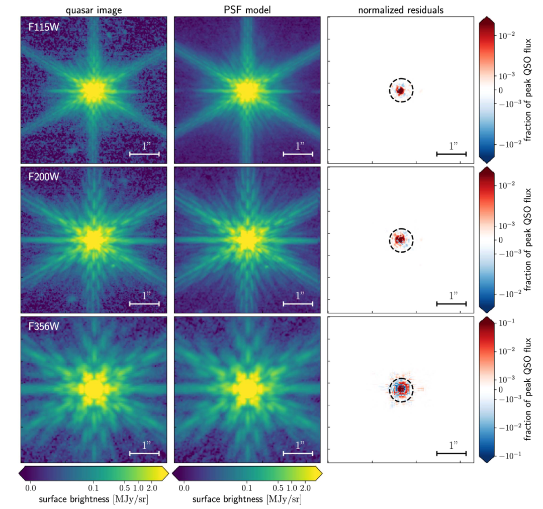 图3: 韦布空间望远镜对该类星体在三个不同红外波段(从上到下分别为1.15、2.00、3.56微米)的观测图像、点扩散函数(PSF)模型图像及二者相减后的归一化残差,虚线圆圈代表0.8角秒直径(来自Eilers et al. 2023)。