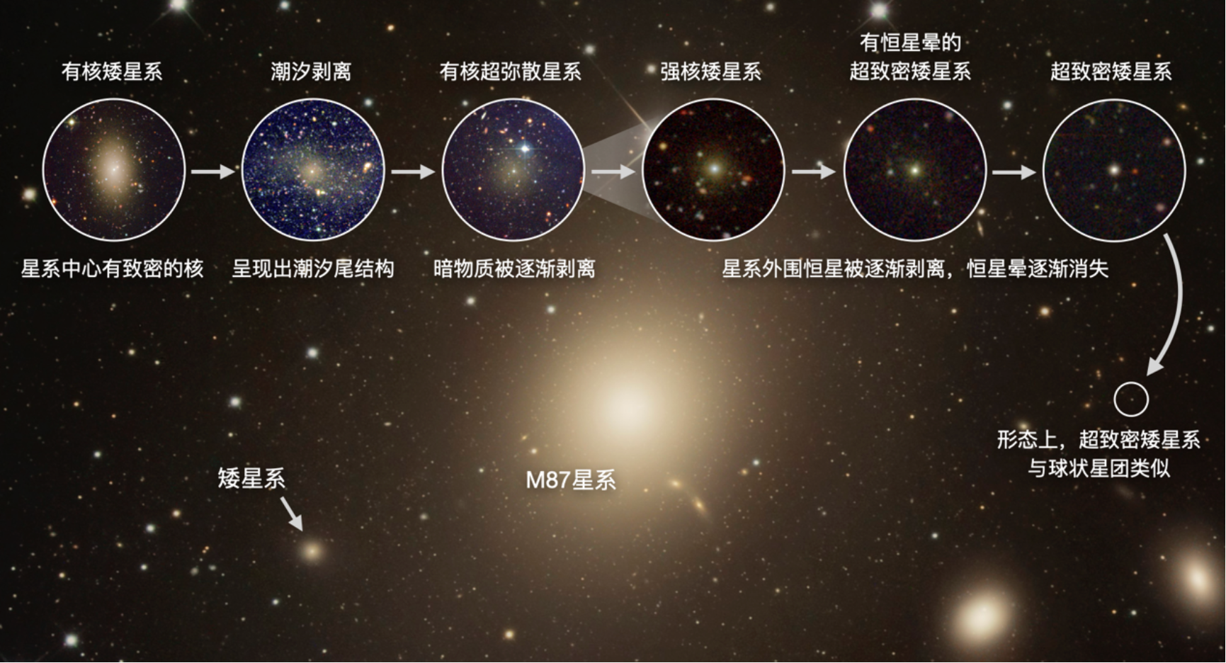 图2 观测得到的从正常矮星系被瓦解形成超致密矮星系的各阶段示意图,整个过程将持续20—30亿年。M87星系周围的数百个超致密矮星系中,可能有相当一部分来自于这种机制。制图:王凯翔;背景图源:NASA/R. Gendler