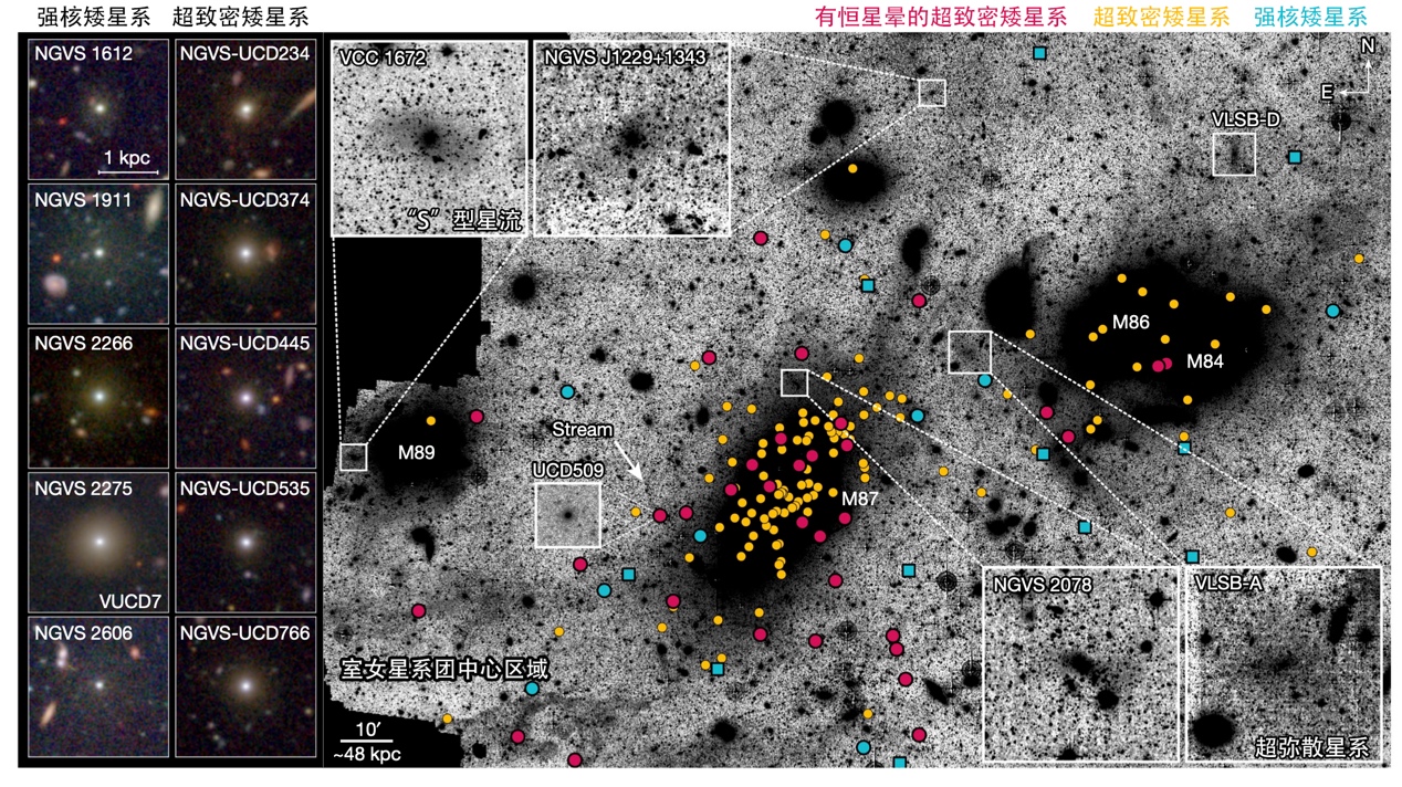 右侧为它们在室女星系团中心区域的空间分布,这些星系大多集中在巨椭圆星系M87周围,表明星系团中心的致密环境对它们的形成有着重要作用