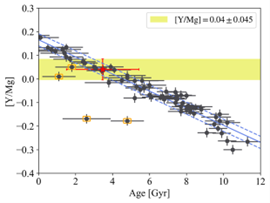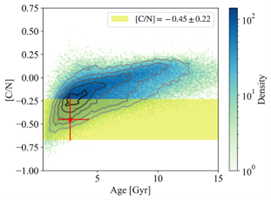 由于双星并合过程不改变系统自诞生时起在银河系中的运动以及重元素丰度特征,这就为该研究团队基于Gaia DR3提供的天体位置测量数据以及SOPHIE高分辨率观测谱从8 UMi的运动学和化学性质推断其真实年龄提供了契机。运动学分析表明,8 UMi是一颗年轻的薄盘星(见图2);作为“化学时钟”的元素丰度比,[C/N]和[Y/Mg],给出的年龄则为30-40亿年(见图3)。两种观测性质皆显示8 UMi是一颗年轻恒星,与该星单星演化的年龄一致,显著年轻于双星演化所需的时间。