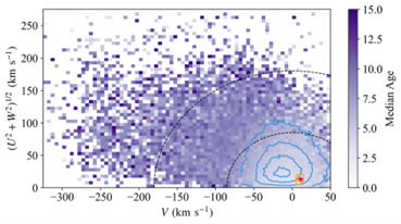 Figure 2: Kinematic properties of 8 UMi and similar red clump giant phase stars in the Milky Way (sample from LAMOST survey; Huang et al. 2020). Different color depths represent varying median ages in each velocity bins.