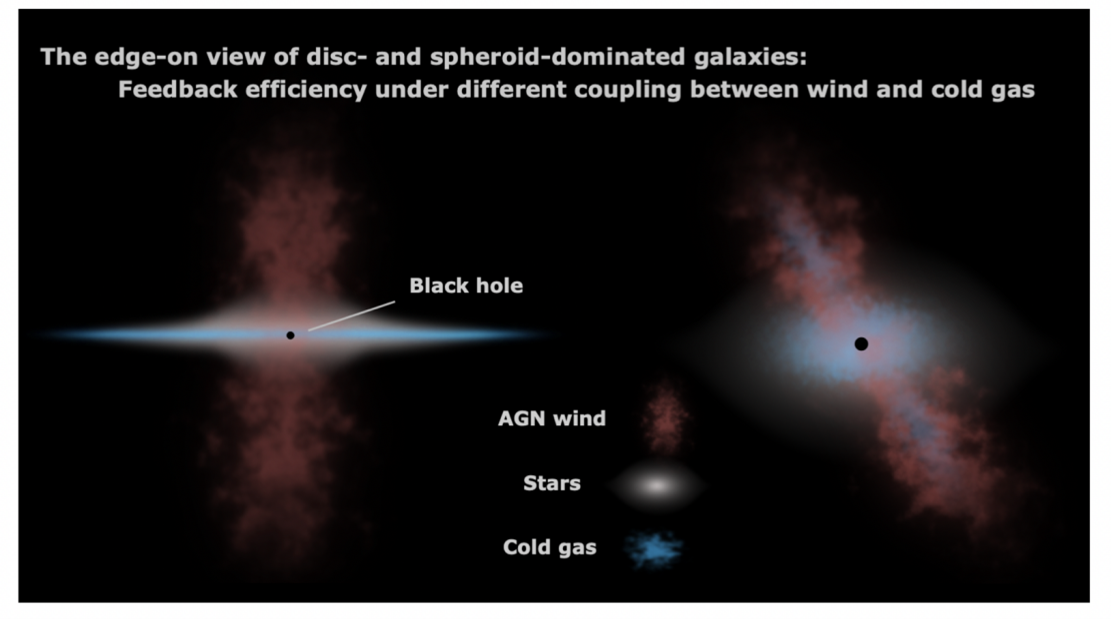 图1:快速旋转星系(左)中的间接作用反馈模式和慢速旋转星系(右)中的直接作用反馈模式。快速旋转的盘状星系由于未受强烈引力干扰,其冷气体通常能以薄盘形式存在,中央黑洞产生的双锥形粒子风对其影响面较小,难以驱动大规模的气体外流,所以该能量主要作用于星系周围环境中,影响星系未来的气体吸积。而经历过大量星系并合的慢速旋转星系,气体受剧烈引力扰动而弥漫于空间,与黑洞产生的粒子风耦合紧密,从而更容易被驱动形成气体外流。