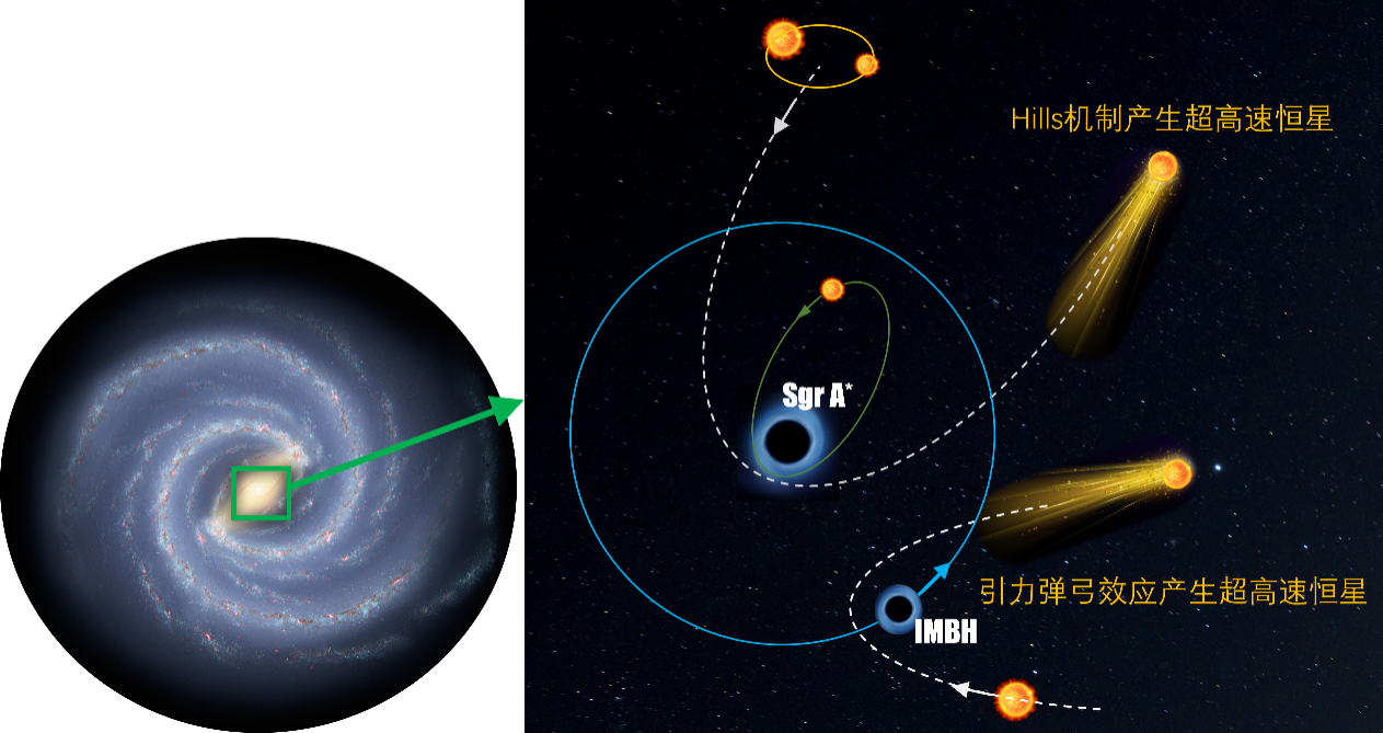 图 1、银河系(左图)中心产生超高速恒星的两种机制的示意图(右图)。一种是靠近超大质量黑洞Sgr A*的双星系统被黑洞的潮汐力瓦解后,其中一颗恒星获得极高速度并射出(Hills机制);另一种是在系统中有另一颗绕转Sgr A*的中等质量黑洞(IMBH)时,靠近其轨道的恒星因引力弹弓效应而高速射出。银河系图片来源:NASA/JPL-Caltech。