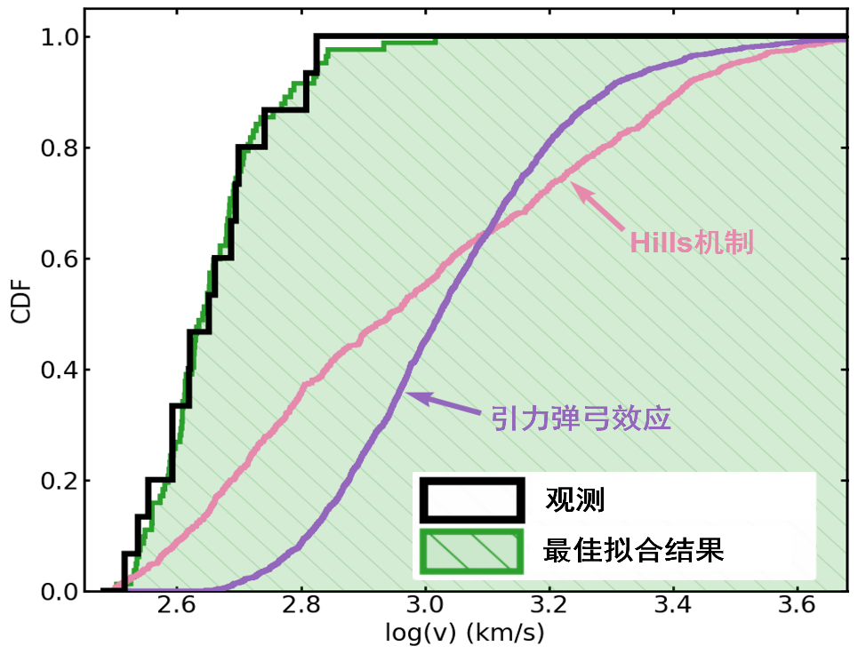 图 2、超高速恒星的速度的累积分布直方图。黑色直方图为MMT项目的观测结果,绿色直方图为本研究对观测数据的最佳拟合结果,二者均具有700千米每秒的速度上限。作为对比,另外两种模型(紫色线代表Hills机制;粉色线代表引力弹弓效应)所预测的速度分布与观测明显不符。